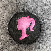 This pink Pretty Girl Silhouette is a must-have for anyone trying to create a spa-worthy bathroom! It features a charming Barbie silhouette and a round black bath bomb that will create an oasis for your next bubble-filled soak. Enjoy a luxurious experience with a touch of fun - no plastic surgery required!